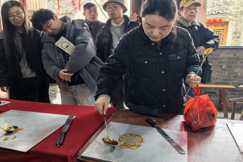下午,非遗体验课堂开课。非遗糖画传承人王老师以铜勺为笔、糖浆作墨,三分钟勾勒“红船”轮廓。教师们把专业所学融入指尖,在王老师的指导下完成“党徽”“天安门”糖画和“红军”“祥龙”等图案,让传统手艺焕发年轻表情,作品可带走,记忆却留下。