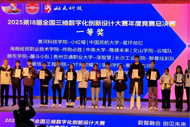 近日,2025 年第 18 届全国三维数字化创新设计大赛年度总决赛于北京顺利收官。自2025年3月份启动以来,全国31个赛区,600余所高校,经过层层选拔入围总决赛参与角逐龙鼎大奖。经过省级赛事和国家级赛事的两轮角逐,艺术设计学院学子共获得14项奖项,其中国家级一等奖1项,取得重大突破。全国三维数字化创新设计大赛(简称 “全国 3D 大赛”)是在国家创新驱动发展战略背景下开展的大型公益赛事,由科技部、教育部、工信部、中国科协等部门指导,国家制造业信息化培训中心、全国三维数字化技术推广服务与教育培训联盟 (3D动力) 等单位共同主办。第 18 届大赛以“数智融合・创见未来”为主题,吸引全国 600多所高校、1000多家企业参与,参赛人数累计突破1000 万人。(图为国赛颁奖现场和部分证书) 斩获本次国家级一等奖的是《天工探秘》团队,这支队伍由艺术设计学院数字媒体技术专业大三学生李梦念、柯秀荣、侯宇彤、韩东丽、张文豪五位同学组成。团队作品精准契合大赛数字化核心主题,将数字技术与文化创新理念进